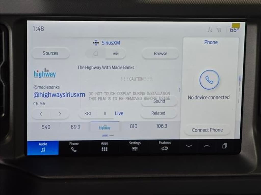 Check out all these great optionsEquipment Group 101A, Sasquatch Package (High Clearance Fender Flares, High Clearance Suspension, Position-Sensitive Bilstein Shock Absorbers, and Wheels: 17" Carbonized Gray Painted Aluminum), 4-Wheel Disc Brakes, 7 Speakers, ABS brakes, Air Conditioning, AM/FM radio: SiriusXM with 360L, AM/FM Stereo, Auto High-beam Headlights, Brake assist, Cloth Bucket Seats, Compass, Delay-off headlights, Driver door bin, Driver vanity mirror, Dual front impact airbags, Dual front side impact airbags, Electronic Stability Control, Emergency communication system: 911 Assist, Exterior Parking Camera Rear, Front anti-roll bar, Front Bucket Seats, Front Center Armrest, Front reading lights, Front wheel independent suspension, Fully automatic headlights, Heated door mirrors, Illuminated entry, Integrated roll-over protection, Internet access capable: FordPass Connect, Low tire pressure warning, Occupant sensing airbag, Outside temperature display, Overhead airbag, Overhead console, Panic alarm, Passenger door bin, Passenger vanity mirror, Power door mirrors, Power steering, Power windows, Radio data system, Remote keyless entry, Security system, SiriusXM w/360L, Speed control, Split folding rear seat, Steering wheel mounted audio controls, SYNC 4, Tachometer, Telescoping steering wheel, Tilt steering wheel, Traction control, Trip computer, Variably intermittent wipers, and Wheels: 16" Bright Polished Silver-Painted Steel.