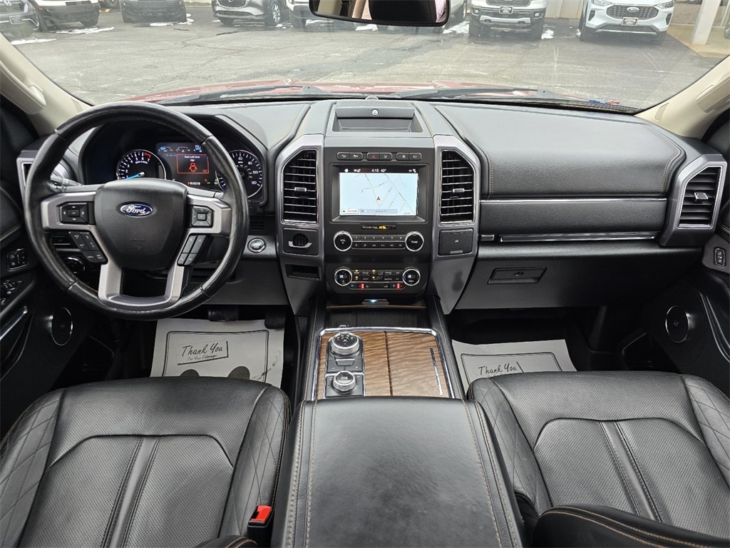 Check out all these great optionsEquipment Group 600A, 12 Speakers, 22" Polished Aluminum Wheels, 3.31 Axle Ratio, 3rd row seats: split-bench, 4-Wheel Disc Brakes, ABS brakes, Adaptive suspension, Adjustable pedals, Air Conditioning, Alloy wheels, AM/FM radio: SiriusXM, AppLink/Apple CarPlay and Android Auto, Auto High-beam Headlights, Auto-dimming door mirrors, Auto-dimming Rear-View mirror, Automatic temperature control, Brake assist, Bumpers: body-color, Compass, Delay-off headlights, Driver door bin, Driver vanity mirror, Dual front impact airbags, Dual front side impact airbags, Electronic Stability Control, Emergency communication system: SYNC 3 911 Assist, Exterior Parking Camera Rear, Four wheel independent suspension, Front anti-roll bar, Front Bucket Seats, Front Center Armrest, Front dual zone A/C, Front fog lights, Front reading lights, Fully automatic headlights, Garage door transmitter, Genuine wood console insert, Genuine wood dashboard insert, Genuine wood door panel insert, Heated & Cooled Perforated Leather Fr Bucket Seats, Heated door mirrors, Heated front seats, Heated rear seats, Heated steering wheel, Illuminated entry, Lane Departure Warning System, Leather steering wheel, Low tire pressure warning, Memory seat, Navigation System, Occupant sensing airbag, Outside temperature display, Overhead airbag, Overhead console, Panic alarm, Passenger door bin, Passenger vanity mirror, Pedal memory, Power door mirrors, Power driver seat, Power Liftgate, Power moonroof, Power passenger seat, Power steering, Power windows, Radio data system, Radio: B&O Sound System by Bang & Olufsen, Rain sensing wipers, Rear air conditioning, Rear anti-roll bar, Rear audio controls, Rear reading lights, Rear window defroster, Rear window wiper, Reclining 3rd row seat, Remote keyless entry, Roof rack, Security system, SiriusXM Satellite Radio, Speed control, Speed-sensing steering, Speed-Sensitive Wipers, Split folding rear seat, Steering wheel mounted audio controls, SYNC 3 Communications & Entertainment System, Tachometer, Telescoping steering wheel, Tilt steering wheel, Traction control, Trip computer, Turn signal indicator mirrors, Variably intermittent wipers, Ventilated front seats, and Voltmeter. Ruby Red 2019 Ford Expedition Platinum 4WD 10-Speed Automatic EcoBoost 3.5L V6 GTDi DOHC 24V Twin Turbocharged